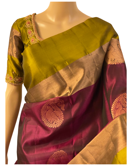 Wine and Green Kanchipuram Silk Saree